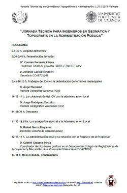 Posted in Calidad métrica, Cartografía, Cartografía histórica, Catastro, Conceptos técnicos, Construcción-edificio-obra nueva, Coordinación Catastro-Registro, Deslindes, GeoBase, Geoportal, Georreferenciación, GML, Impuesto (IBI), Infraestructura de Datos Espaciales (IDE), Levantamiento Topográfico, Ley 13/2015, Linderos, Medio Ambiente, Ordenación del territorio, Ortofotos, Precisión métrica, Registro de la Propiedad, Sig, Técnicos, Términos municipales, Topografía, Urbanismo, Usos cartografía catastral | Etiquetado: Administración Pública, Artículos prensa, Ayuntamientos, Ciudadanos, Comunidad Valenciana, Debates, Documentación, Documentos gráficos, España, Eventos, Formación, Geomática, Grupos de trabajo, Jornadas, Legislación, Normativas, Opinión, Para Técnicos, Ponencias, Universidad | Comentarios desactivados en Ponencias Jornada Técnica para Ingenieros en Geomática y Topografía en la Administración Pública. 21 Febrero 2019, Valencia