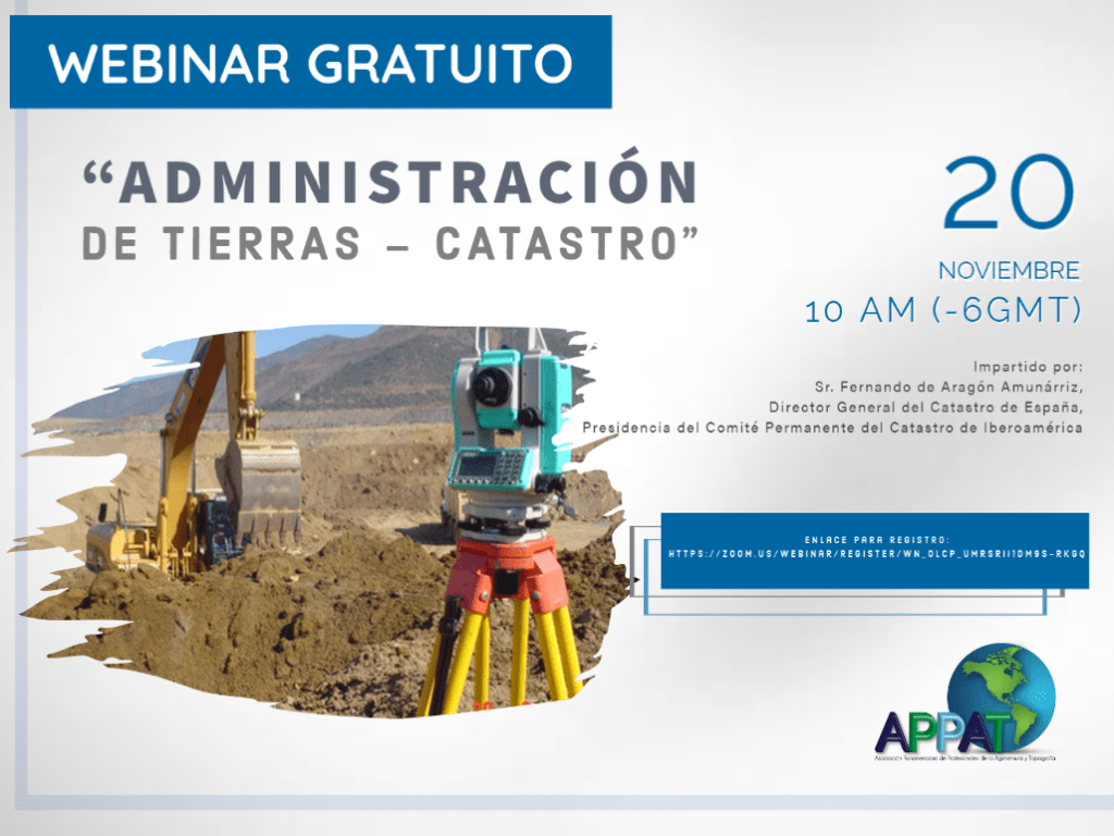 La Asociación Panamericana de Profesionales de la Agrimensura y Topografía (APPAT) ha organizado el webinar gratuito sobre «Administración de Tierras – Catastro» en iberoamerica, para este viernes 20 de noviembre de 2020.