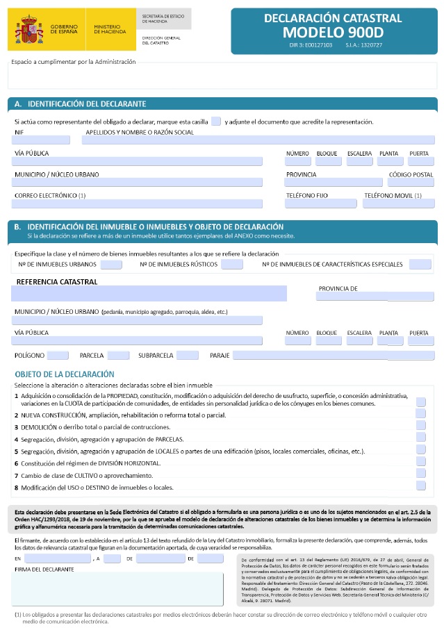 El 5 de Diciembre de 2019 se publicó en el BOE la Orden por la que se aprueba el nuevo Modelo de Declaración de Alteraciones Catastrales y se determina la información gráfica y alfanumérica necesaria para la tramitación de comunicaciones catastrales.