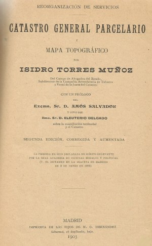 A continuación os dejo en formato pdf la primera mitad del libro que habla sobre la Reorganización de Servicios del «Catastro General Parcelario y Mapa Topográfico» cuyo autor es Isidro Torres Muñoz (del Cuerpo de Abogados del Estado, Subdirector de la Compañia Arrendataria de Tabacos y Vocal de la Junta de Catastro), y publicado en el año 1903, con más de 500 páginas. Este tipo de libros no son fáciles de encontrar, así que ya que dispongo de él lo dejo en el blog para poder compartirlo. Para quien le interese conocer más sobre estos temas, que aunque tienen más de cien años no están tan lejanos.