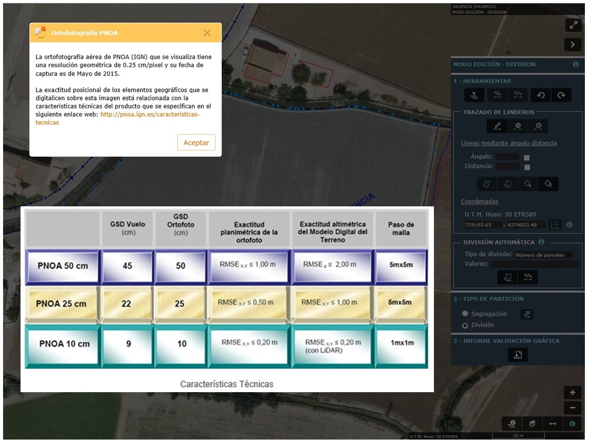 “La ortofotografía aérea de PNOA (IGN) que se visualiza tiene una resolución geométrica de 0.25 cm/pixel y su fecha de captura es de Mayo de 2015.